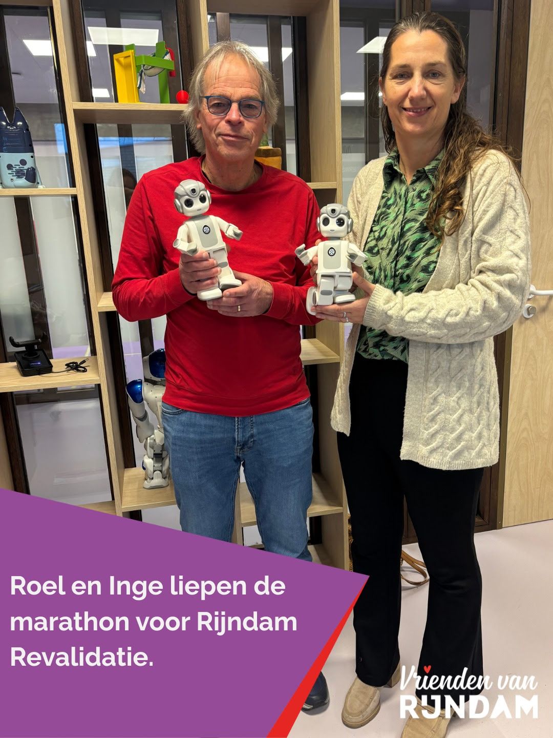 En dat was het zeker, in alle opzichten. Roel liep samen met zijn nicht Inge de Marathon van Rotterdam. Voor Roel zijn 30e Rotterdam Marathon, voor Inge haar 1e. Met hun sportieve inzet haalden zij een geweldig bedrag op voor de aanschaf van twee nieuwe robotjes voor het Rotterdams Onderwijs- en Revalidatiecentrum (ROeR). Deze Robin-robotjes zullen worden ingezet voor logopedie, ergotherapie én voor verschillende bewegingsoefeningen in het AT-Lab van Rijndam Revalidatie. Dankzij deze robots kan Rijndam hun kinderen nog beter ondersteunen op een speelse, interactieve en effectieve therapie. De Vrienden van Rijndam hebben hun dankbaarheid geuit met de volgende woorden: "Dank aan Roel en Inge voor jullie enorme inzet, en opnieuw dank aan Stichting Pallieter voor de fijne samenwerking en jullie betrokkenheid."